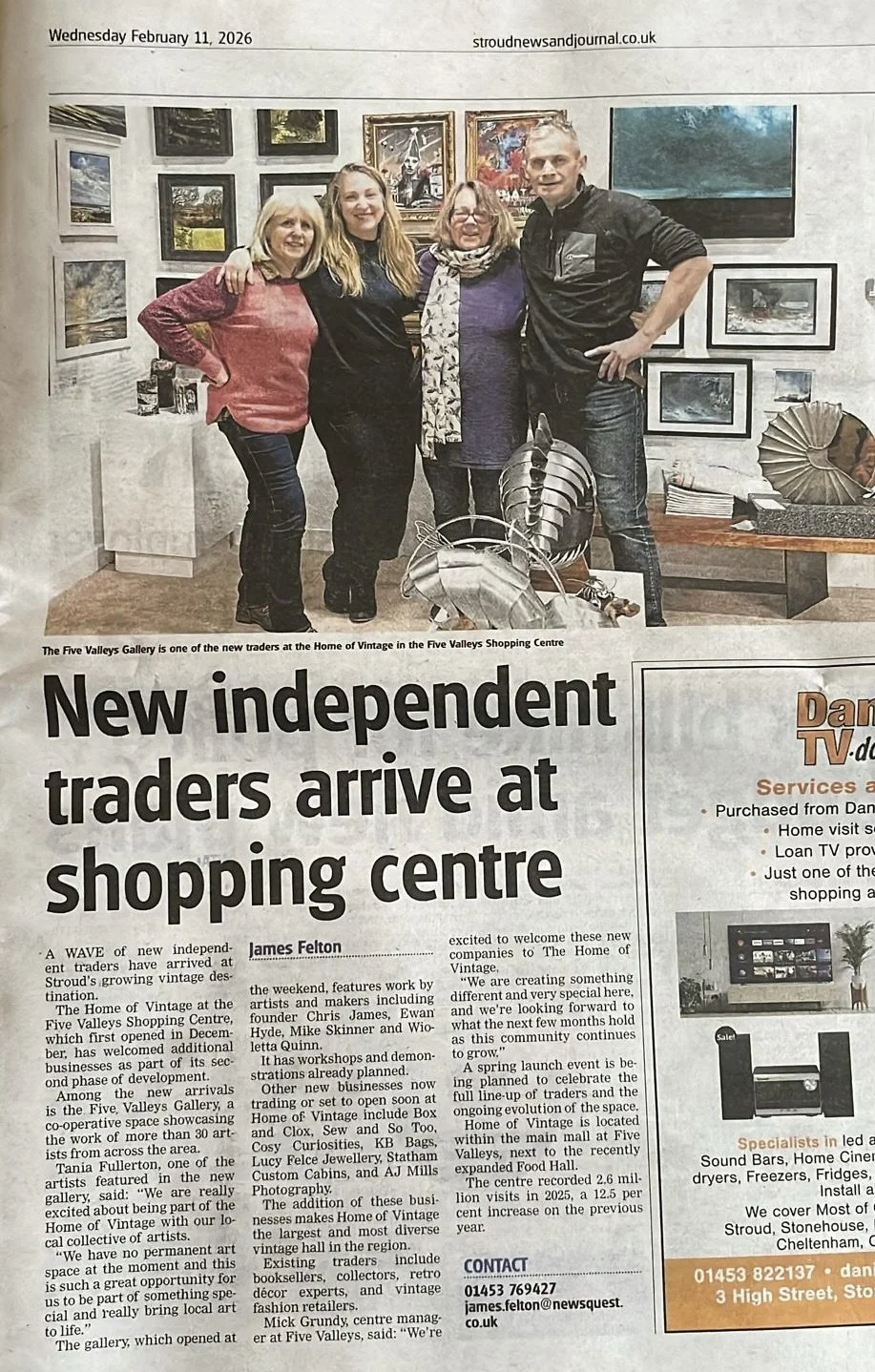 Featured in the Stroud News & Journal following the lauch of Five Valleys Gallery at the Five Valleys Shopping Centre. As part of the founding team, I contributed to the gallery’s branding, marketing and curatorial direction.
